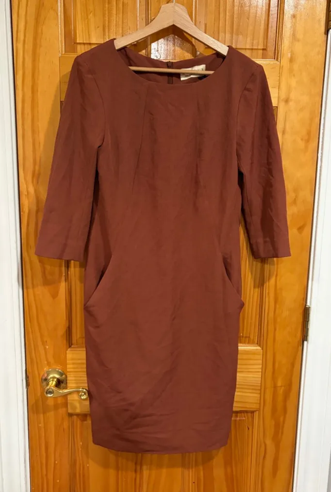 Classic MM.LaFleur sheath dress in a rich brown tone, designed for polished workwear and professional settings. Clean, minimalist silhouette with flattering seam construction and 3/4 sleeves—perfect for office, meetings, or a capsule wardrobe. Details: Brand: MM.LaFleur Size: 6 Color: Brown Style: Sheath dress Sleeves: 3/4 length Neckline: Boat neck Closure: Back zip Material: Polyester Blend Condition: Very good pre-owned condition. Light wrinkling from storage. No holes or stains noted. Approximate measurements are not listed; all measurements are approximate and may vary slightly. Colors may vary slightly due to lighting and monitor settings.