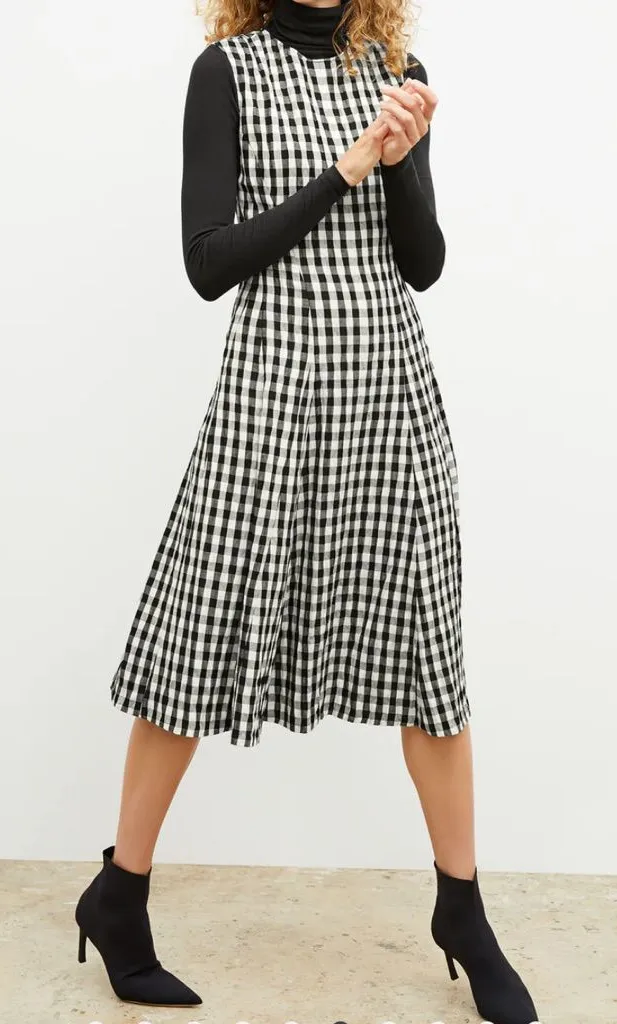Size 12 NEW WITH TAGS The Nyla dress is the equally elegant sister of the beloved Gabriella dress—but with a crew neck and longer A-line fit. The vertical seaming hits in all the right places, while the gingham pattern adds texture to this flowing, stretch-wool silhouette.