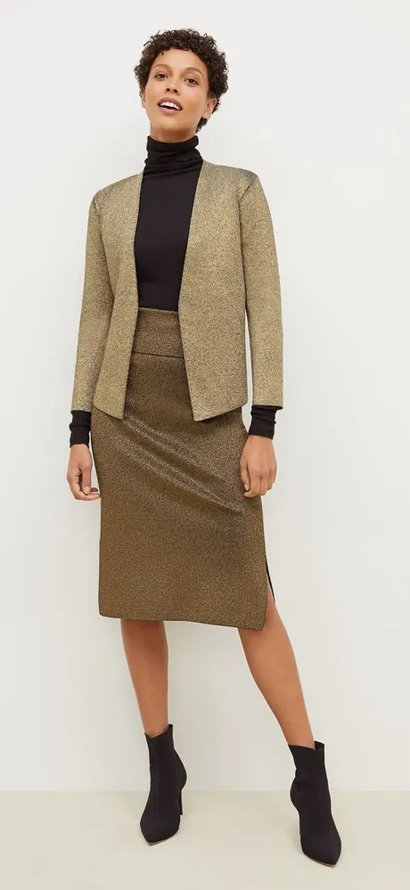This M.M. classic has the structure of a jacket but the softness and stretch of a cardigan. In other words, it's a jardigan! Bold and eye-catching, this sparkly version helps you exude confidence everywhere you go. Wear it to pull a special-occasion look together or to give your Power Casual outfits a little extra oomph.