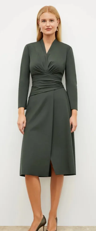 Excellent condition Fit: Tailored Body Type: Bust-friendly, Full hips-friendly, Hips-friendly, Middle-friendly, Tall-friendly Neckline: V-neck Bottom shape: A-line Bottom length: Midi FEATURES Machine-Washable Wrinkle Resistant Water Repellent High Stretch 72% Polyester, 16% Cotton, 12% Elastane