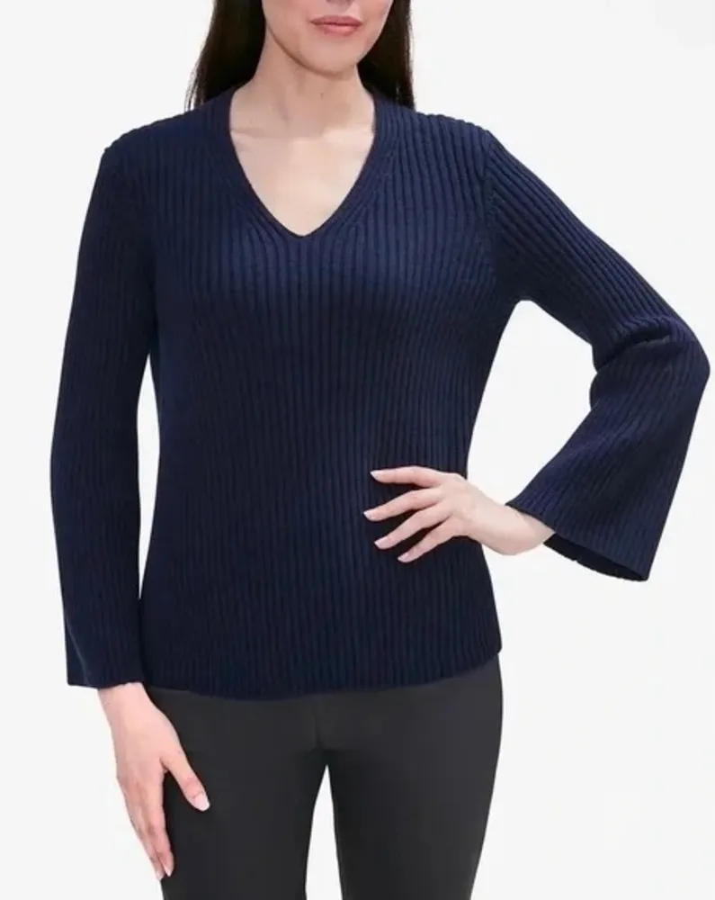 Gorgeous pullover sweater by MM Lafleur. “The Min Cashmere Merino Wool Rib V Neck Sweater” style in navy blue merino wool & cashmere knit. V-neck & bell sleeves. Bust 35-39“, length 23“, sleeve length 20.5“. Size XS, excellent preowned condition. All measurements taken with garment lying flat & doubled where applicable. From the MM Lafleur website: "The ultimate, never-take-it-off sweater, the Min is the next best thing to cozying up in bed all day. Knit from a super-soft wool-cashmere blend, it features a relaxed fit and flattering V neckline. Meanwhile, the subtle bell sleeves are slightly cropped, so there’s no need to roll them up when you’re buckling down."