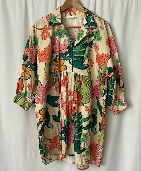 Super Cute MNG Multicolor Tropical Floral 3/4 Sleeve Babydoll Dress. Size 2. What a pretty dress! Dress has vibrantly colored flowers and made of π―% cotton for extra comfort. You can also add a cute belt to cinch in the waist. Measurements: Armpit to armpit: 22β Entire length: 32β **Comes from a clean, smoke free home**