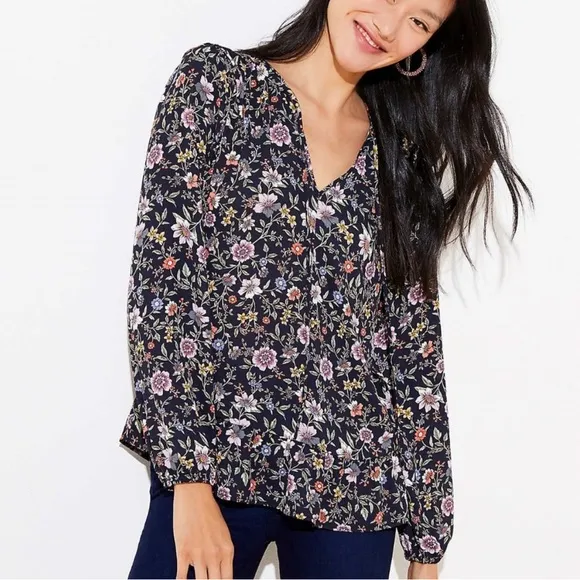 LOFT Wildflower Floral Ruffle Tie Neck Peplum Hem Boho Cottagecore Blouse Size Medium From its fla... Show more