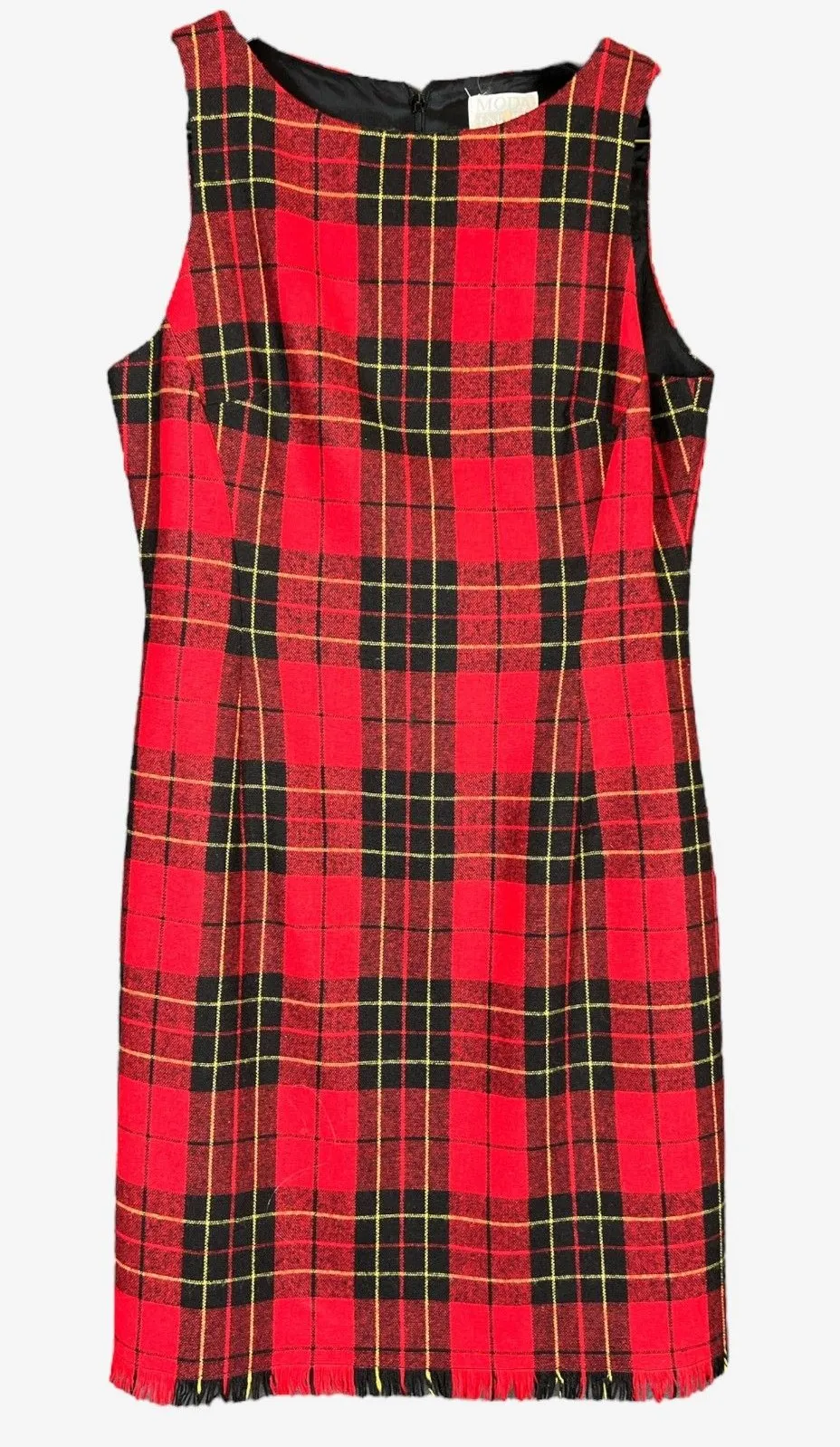 Vintage 1990s era sleeveless plaid tartan dress, ready for Holiday 25 family pictures with a tall boot lined frayed hem princess seams, bust darting wool blend , original label missing no stretch it's a fitted body con dress Match these measurements with a similar item in your closet that fits just right for the best fit! * bust 33 * waist narrowest 28 * hips widest 36 * length 32 fits a size 2 for reference offers welcome