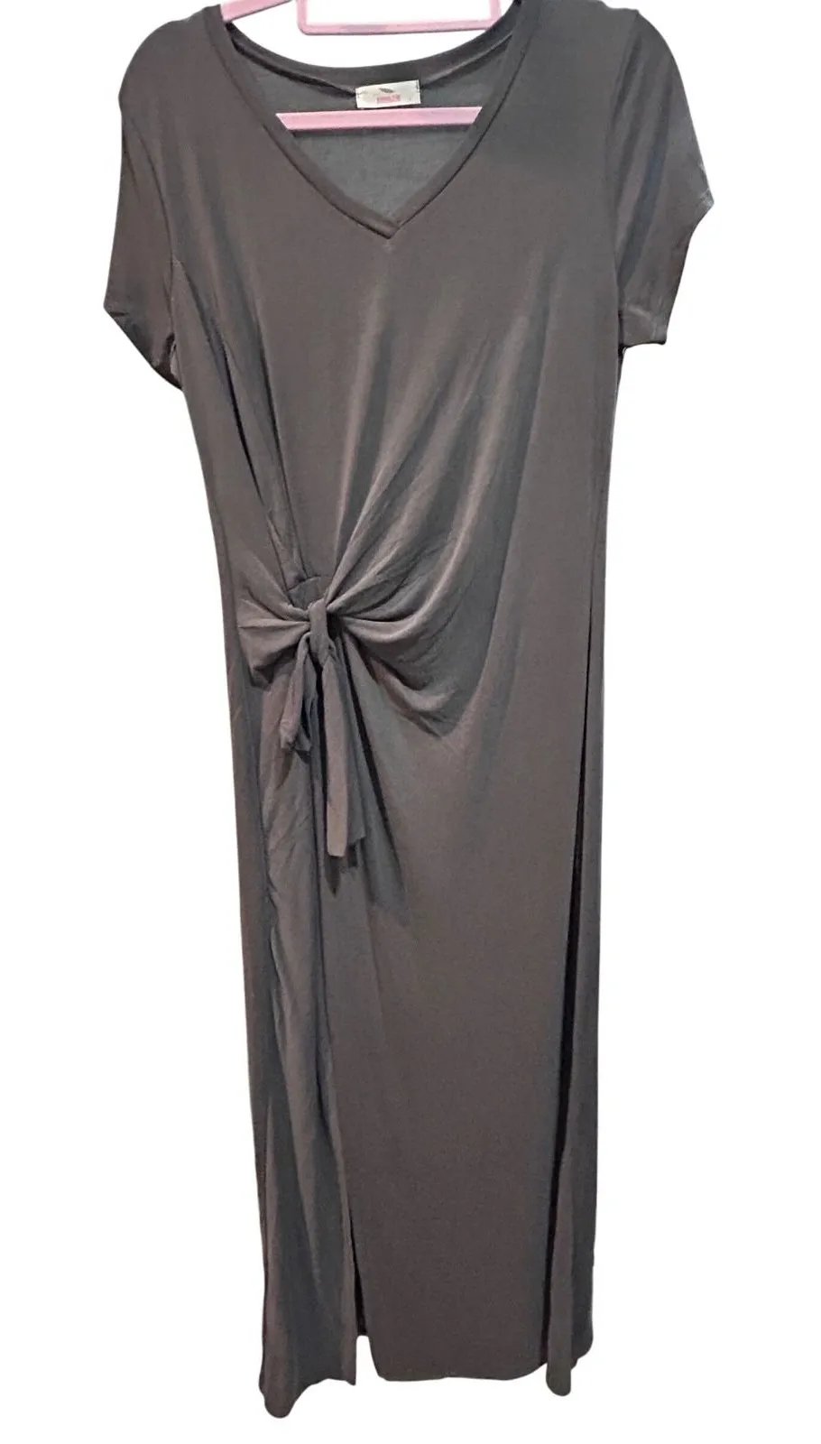 Gray knit maxi dress with a flattering V-neckline and short sleeves. This dress features a chic tie-waist detail on the left side, creating a ruched effect and a subtle side slit. Perfect for casual outings, brunch with friends, or a relaxed vacation day. Style: T-Shirt Dress, Maxi Dress Length: Long Department: Women Sleeve Length: Short Sleeve Pattern: Solid Occasion: Casual Material: Modal, Polyester Fabric Type: Knit Neckline: V-Neck Season: Summer, Spring Sleeve Type: Cap Sleeve Closure: Pullover - I ship in 1-2 days. - The more you bundle, the more free items you get! - Shop my closet for: jeans, workout, athletic, shoes, career, resort, vacation, swim, fall, work, lounge, cashmere, chic, boho and brands such as: Nike, Athleta, Torrid, Knox Rose, Anthropologie, Lulu, For Love, Entro, LOFT, Lilly