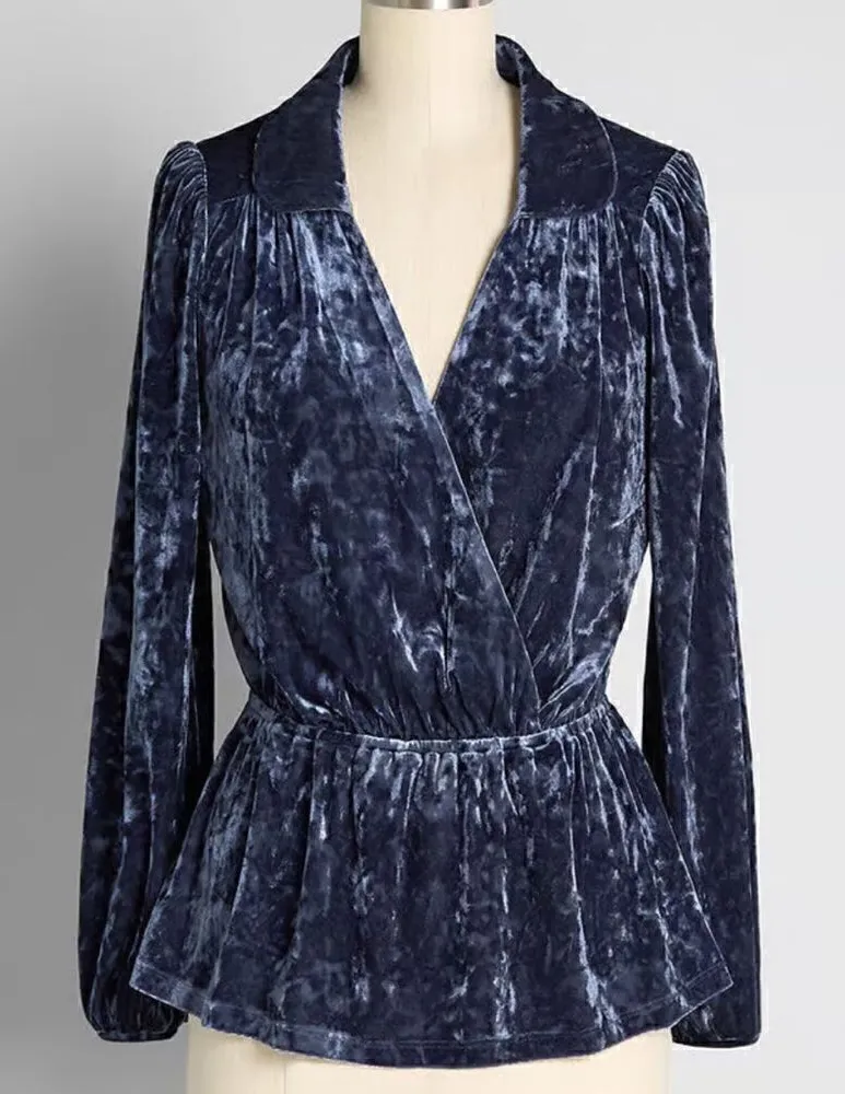 Modcloth Peak of Chic Velvet Top Faux Wrap Puff Sleeve icey Blue Size Small. Soft Crushed velvet fabric. Long puff sleeves. Collar Surplice neck. Faux wrap front. Elastic waist has stretch. Peplum hem. NWT