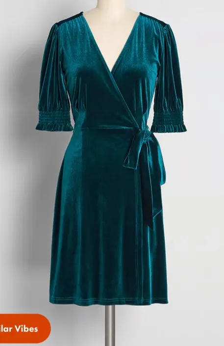 Wrap yourself up in this soft, luxurious blue velvet mini dress. Smocked detailing at the cuffs with... Show more