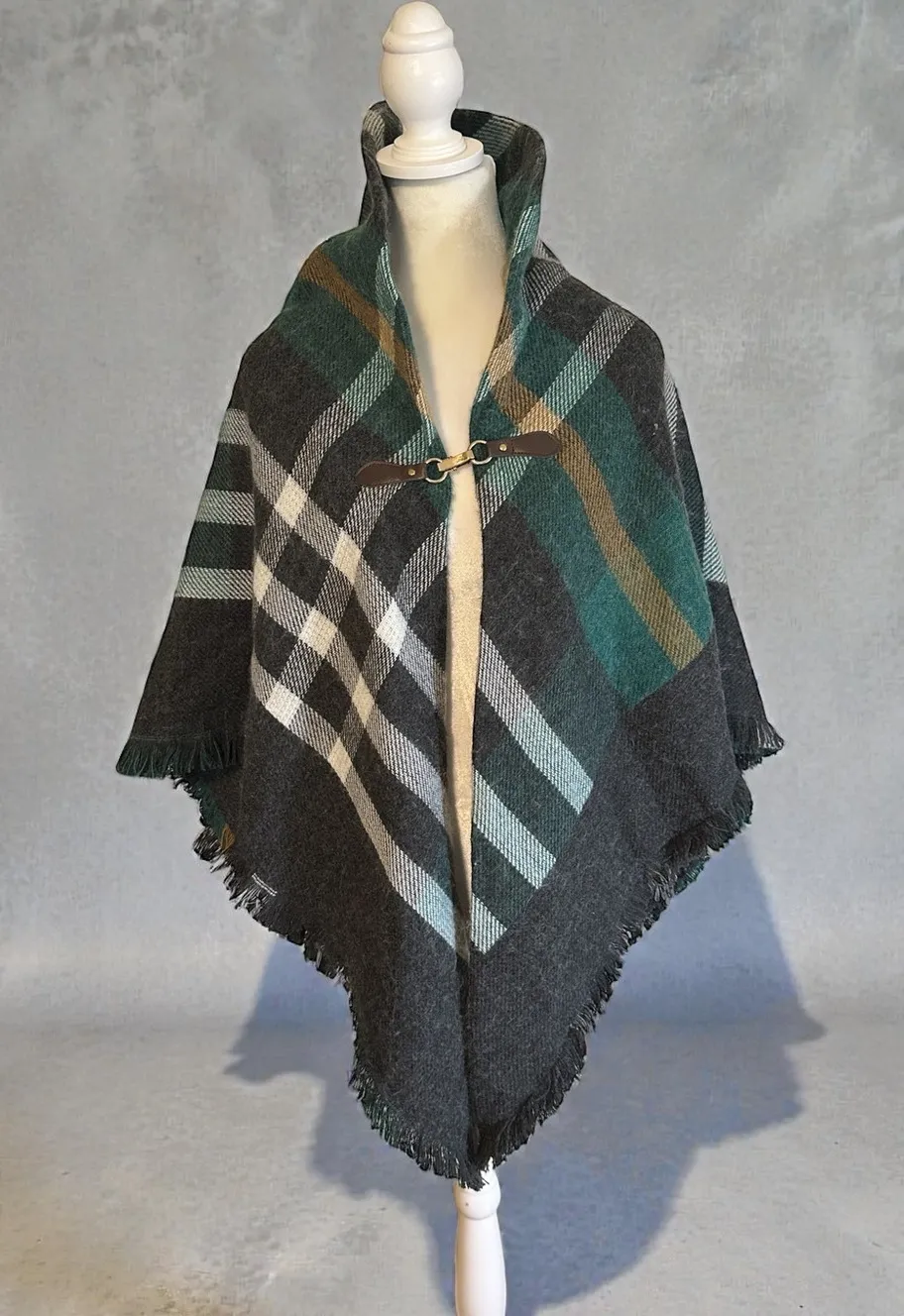 Keywords: plaid, cape, poncho, shawl, scarf, fringe, buckle closure, fall fashion, winter accessory,... Show more