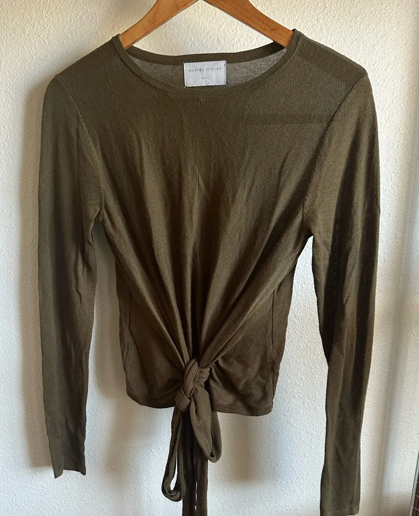 This is a dark green modern citizen top. It is long sleeved with stretch and has a front tie/wrap design. There is a flaw on the front there’s a hole on the shirt that could be fixed with a good seamstress. The price reflects the flaw. Other than that the top is beautiful. *Look at the last 4 pics to see the hole in the center front of top. •Condition: Fair* •Size: S •Material: See pic of tag •Measurements: Pit-To-Pit: 17” Length front 17” back 18.5” Tags: Modern Citizen; wrap style; casual; business casual; olive green; fall; winter