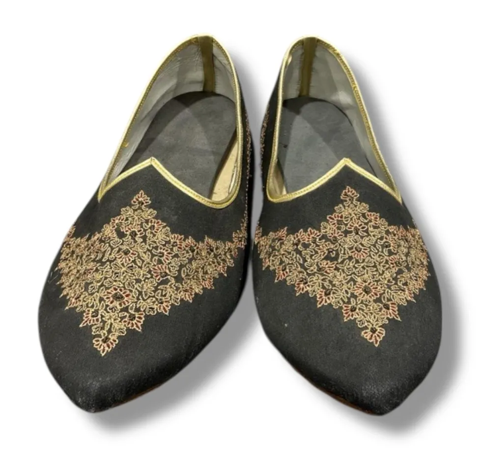 Excellent condition and beautifully crafted, these black Mojari slip-on dress shoes showcase fine embroidery and a well-structured silhouette with minimal signs of wear. The stitching is clean and intricate, reflecting quality craftsmanship and attention to detail, while the structured sole and padded interior offer lasting comfort and durability. Designed with traditional elegance and modern versatility, these women’s Mojaris feature ornate gold-toned embroidery, a sleek pointed toe, and an easy slip-on style. Perfect for weddings, festive celebrations, formal events, or elevated everyday wear, they pair effortlessly with ethnic outfits as well as contemporary dresses or tailored pants. Women’s size 9.