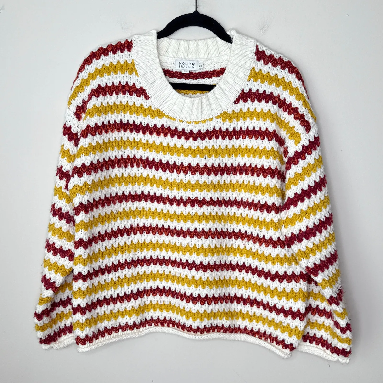 Molly Bracken Chunky Knit Striped Long Sleeve Retro Sweater Size M/L - zig zag inspired retro looking sweater - acrylic - machine wash ** some piling and loose threads noted. Please see photos. APPROX. MEASUREMENTS: *Measurements are taken with item lying flat on table. Pit to pit: 23" Shoulder to hem: 24" * open to reasonable offers * ships next business day * pet-free and smoke-free home * all items washed, unless dry clean only or hand wash label. Please, wash to wear. * see pictures for details. Colors can vary on different devices.