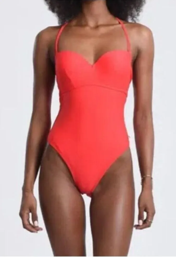 Description: SWEETHEART ONE-PIECE SWIMSUIT IN ORANGE RED This one piece fits like a glove and cover... Show more