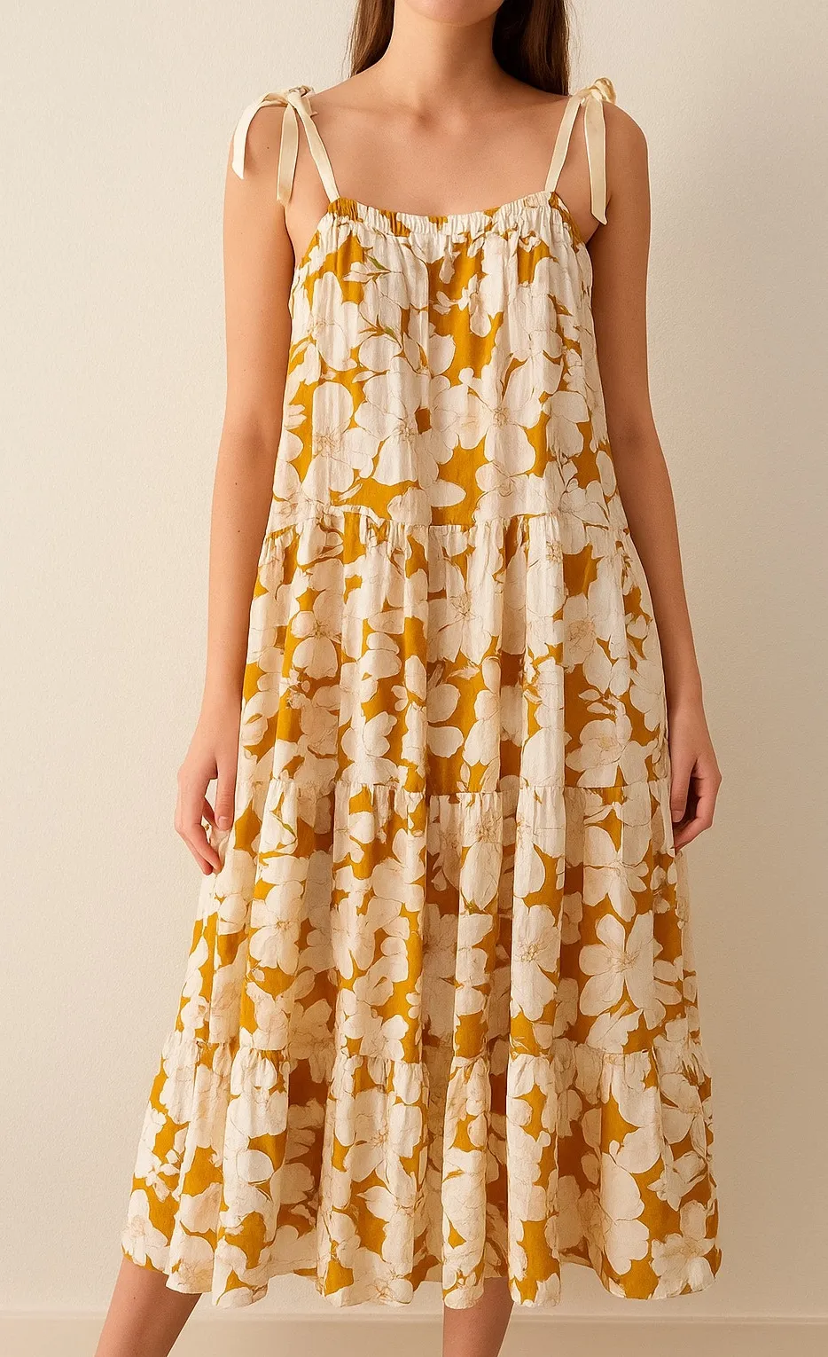 Size: Small Color: Yellow and white floral Brand: Mon Renn Retail Price: Estimated $180 Description: Breezy and effortless, this Mon Renn tiered maxi dress stuns with a bold marigold and white floral print, soft tie shoulder straps, and a lightweight, flowy silhouette. Crafted from a sustainable lyocell blend with a rayon lining, this piece blends easy femininity with elevated design—perfect for summer outings, vacation wear, or spring events. Tags: floral vacation dress, resort wear, coastal style, marigold maxi, sundress vibes, feminine silhouette, Australian designer, romantic daywear, spring wedding guest, effortless chic