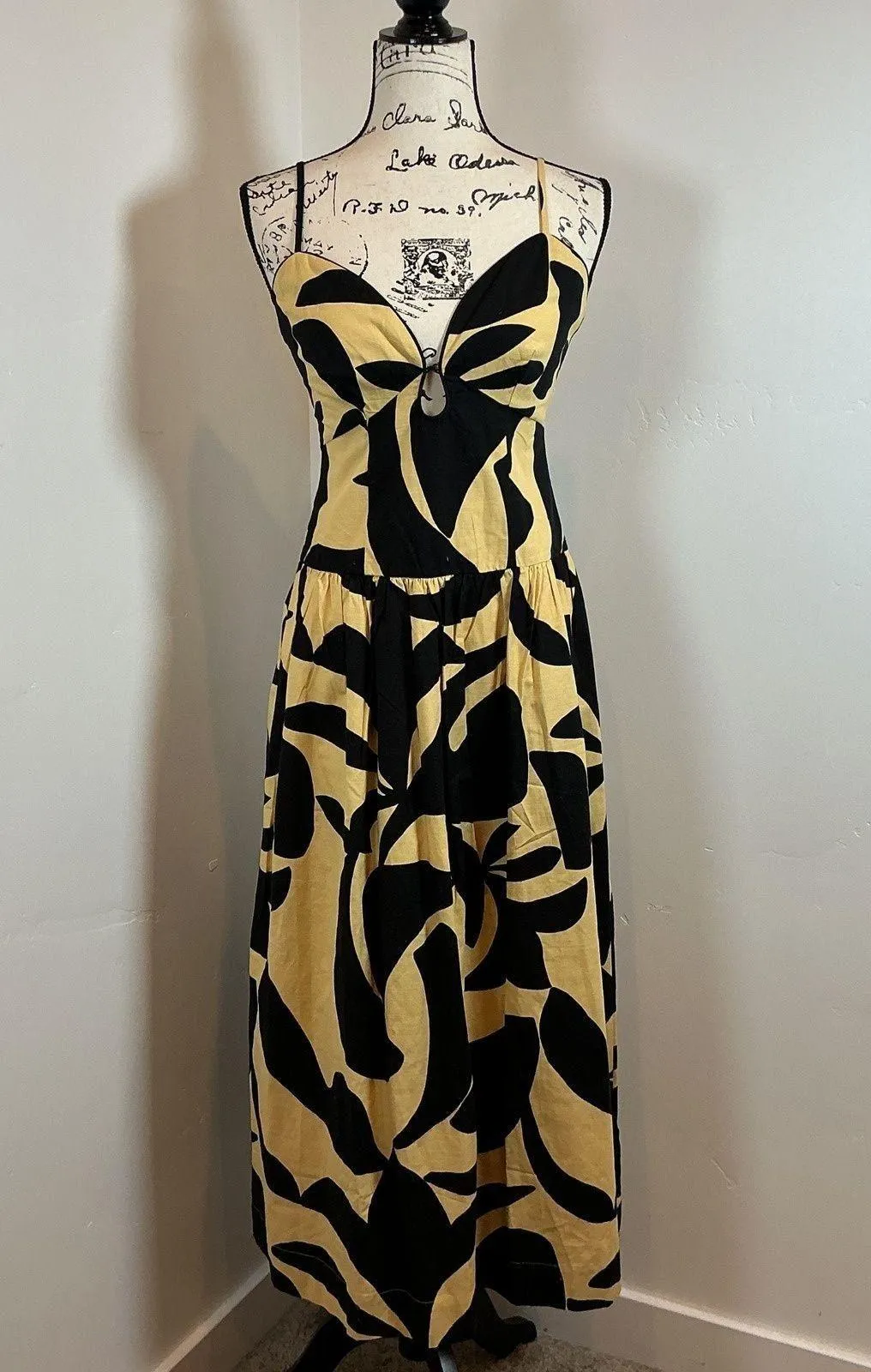 Enliven your wardrobe with this striking Mon Renn midi dress. A bold abstract print in black and beige ensures a head-turning statement. The sleeveless design and flattering silhouette make it perfect for warm weather occasions. Features include a unique keyhole detail at the bust, adjustable spaghetti straps, a comfortable fit, and convenient side pockets. Ideal for a summer garden party, a sophisticated brunch, or a chic evening event. Style: Sundress, Tank Dress, A-Line Dress Length: Midi Department: Women Sleeve Length: Sleeveless Pattern: Geometric Occasion: Party/Cocktail, Casual, Travel Material: 100% Cotton Neckline: Sweetheart Theme: Art Fabric Type: Woven Season: Summer, Spring Sleeve Type: Strappy Sleeve Closure: Zip Keywords: Mon Renn, Midi dress, Abstract print, Sleeveless dress, Black and beige, Designer dress, Summer dress, Casual dress, Party dress, Spaghetti strap dress, Keyhole dress, Cotton dress, XS dress, New with tags