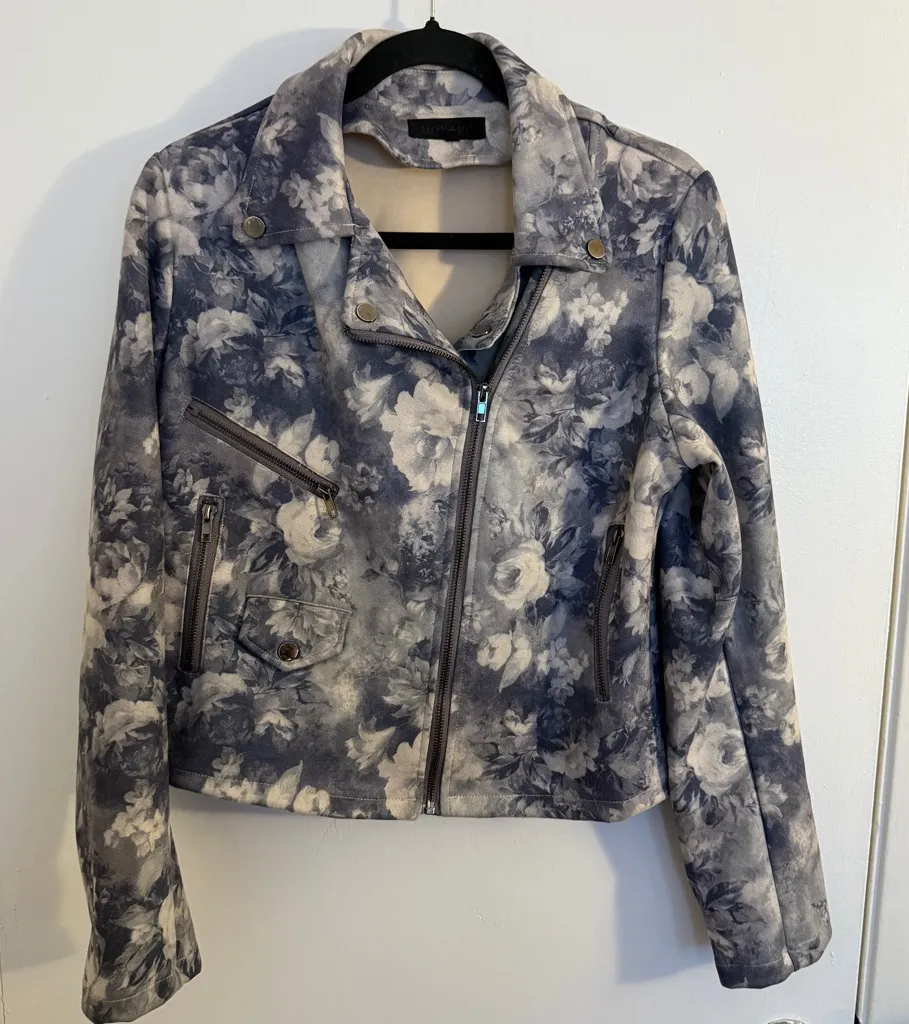 Stylish floral women's jacket with a chic design. Perfect for adding a touch of elegance to any outfit. Beautiful jacket. Measures 20" under arm across chest, 21" long and 25" sleeve. Excellent preowned condition.