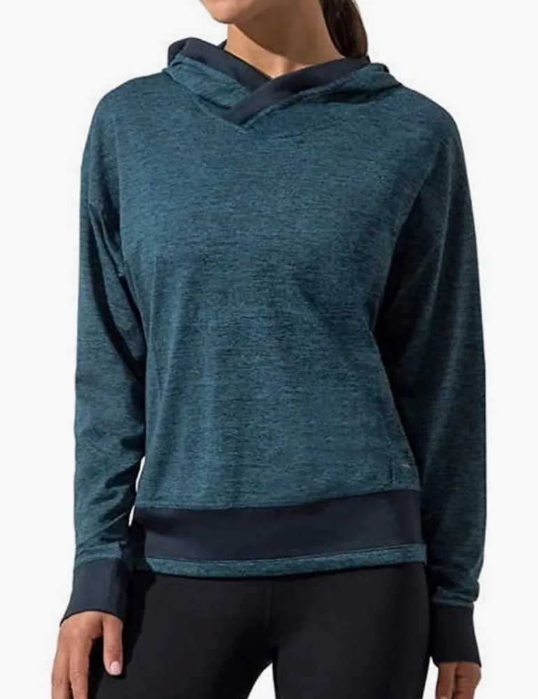 Mondetta Performance & Luxury Long Sleeve Hoodie Hooded Pullover Top Teal Heather Women’s Large L 12-14. Long sleeve, ribbed accents at the cuff and hem, stretch performance fabric, crossover design at the hood neckline. Good condition. Approximately 24” pit to pit laid flat and 24” in length at the center back from neckline seam, excluding hood. Gym Yoga Workout Working Out Running Spring Summer Athletic Athleisure Performance Training.