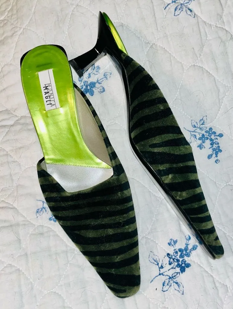 Monica Magli Vintage Velvet Kitten Heels sz 8.5 Amazing shoes! Green & black zebra print velvet shoes by Monica Magli Soft velvet pointed toe Slip on mule style Kitten heel 1.5 inches Size 8.5 (39) Great condition for age
