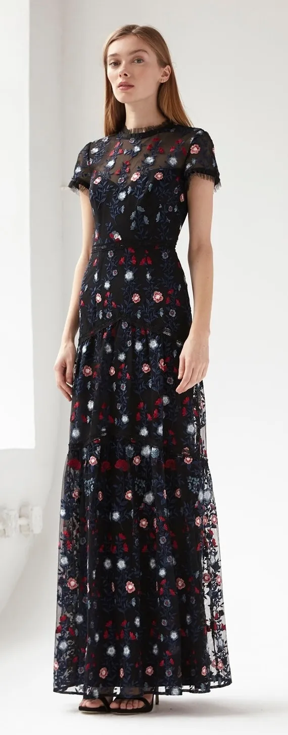 Monique Lhuillier Dark Floral Embroidered Tiered Tulle Column Maxi Gown Dress in Black. Enchanting f... Show more