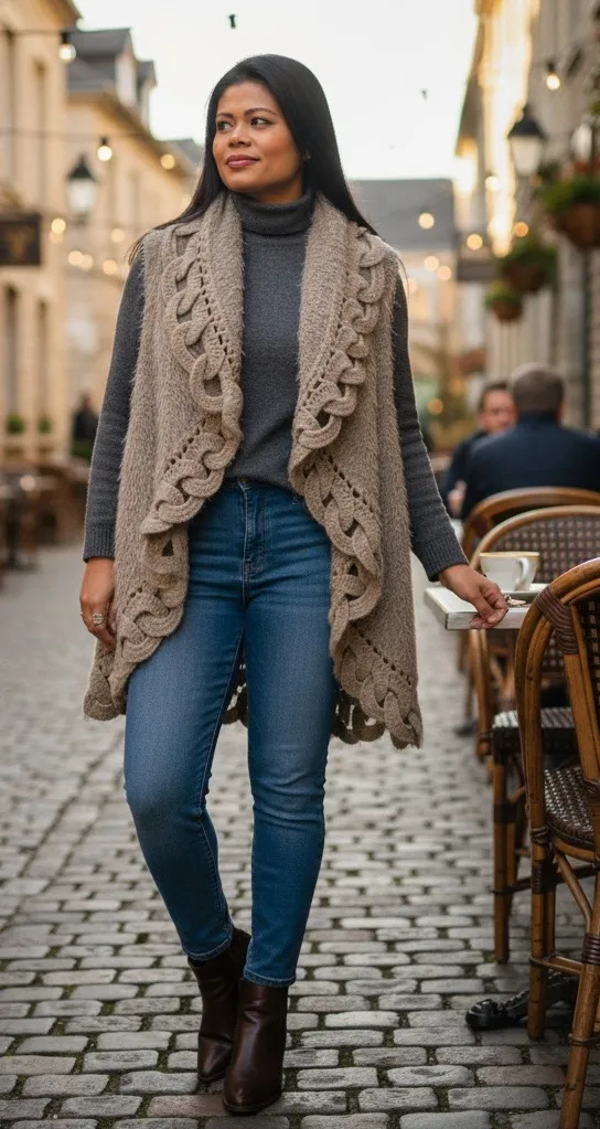 Mono Reno Knitwear Taupe Cable Knit Fuzzy Open Front Vest Boho Style Soft, stylish, and full of texture — this Mono Reno Knitwear taupe open-front vest features a cozy fuzzy knit body with intricate cable knit trim detailing. The scalloped edge design adds a touch of boho charm, making it perfect for layering over long sleeves, dresses, or turtlenecks in fall and winter. Details: • Brand: Mona Knitwear • Color: Taupe / Light Brown • Style: Open Front Vest • Material: 50% Acrylic, 30% Nylon, 20% Polyester • Style No. M8687G • Professional dry clean recommended • Approx. length: ~27” (shoulder to hem) • Excellent pre-owned condition — no flaws noted Cozy yet elegant, this vest pairs beautifully with jeans and boots or over a casual knit dress. Keywords: fuzzy knit vest, boho cardigan vest, cable knit open front, taupe sweater vest, textured layering piece, cozy fall fashion, soft acrylic knitwear, scalloped edge vest, casual chic outerwear, women’s boutique vest, bohemian layering, neutral knit top, Mona Knitwear vest, warm sleeveless cardigan, statement texture style