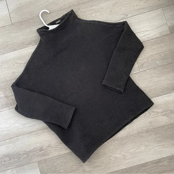 Monrow Asymmetric Ribbed Mockneck Sweater in the color Dark Brown. Long sleeve. Short length. Ribbed. Thicker, medium weight knit fabric. Mock neckline that is asymmetrical / pulled to the side. Unique piece that holds structure. Size xsmall. 55% cotton, 45% polyester. Super cute minimalist, fashionable, edgy chic style. Perfect for office, work, school, casual everyday winter wear.