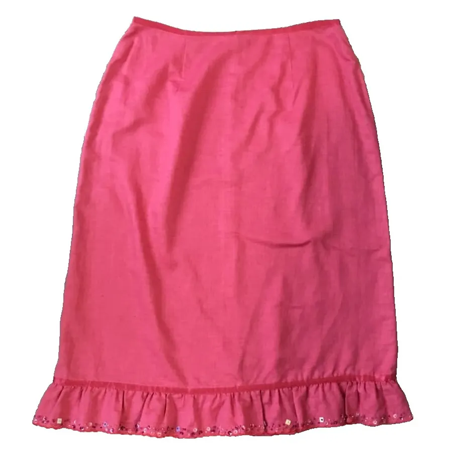 Monsoon Linen Cotton Blend Skirt Womens US 10 M UK 14 Boho Cottage Core Peasant Tiered Beaded Condition - pre-owned - no stains, holes or issues noted. Please see all photos as they are part of the description. Brand: Monsoon Women's Size: US 10 Medium / UK 14 / EU 42 Color: Dark Pink Back Zipper Tiered Hem with Scalloped, Beaded Trim Detail Linen / Cotton Blend Hand Wash Style Profile: Classic, Cottagecore, Bohemian, Peasant, Modest, Country Measurements - are in inches, approximate & taken flat, unless otherwise noted Waist - 30" doubled Hips - 43" doubled Skirt Length - 28" (As all clothing will fit differently from person to person, please compare measurements given in this listing to the measurements of a good fitting clothing item you currently wear for best comparison). 7 oz