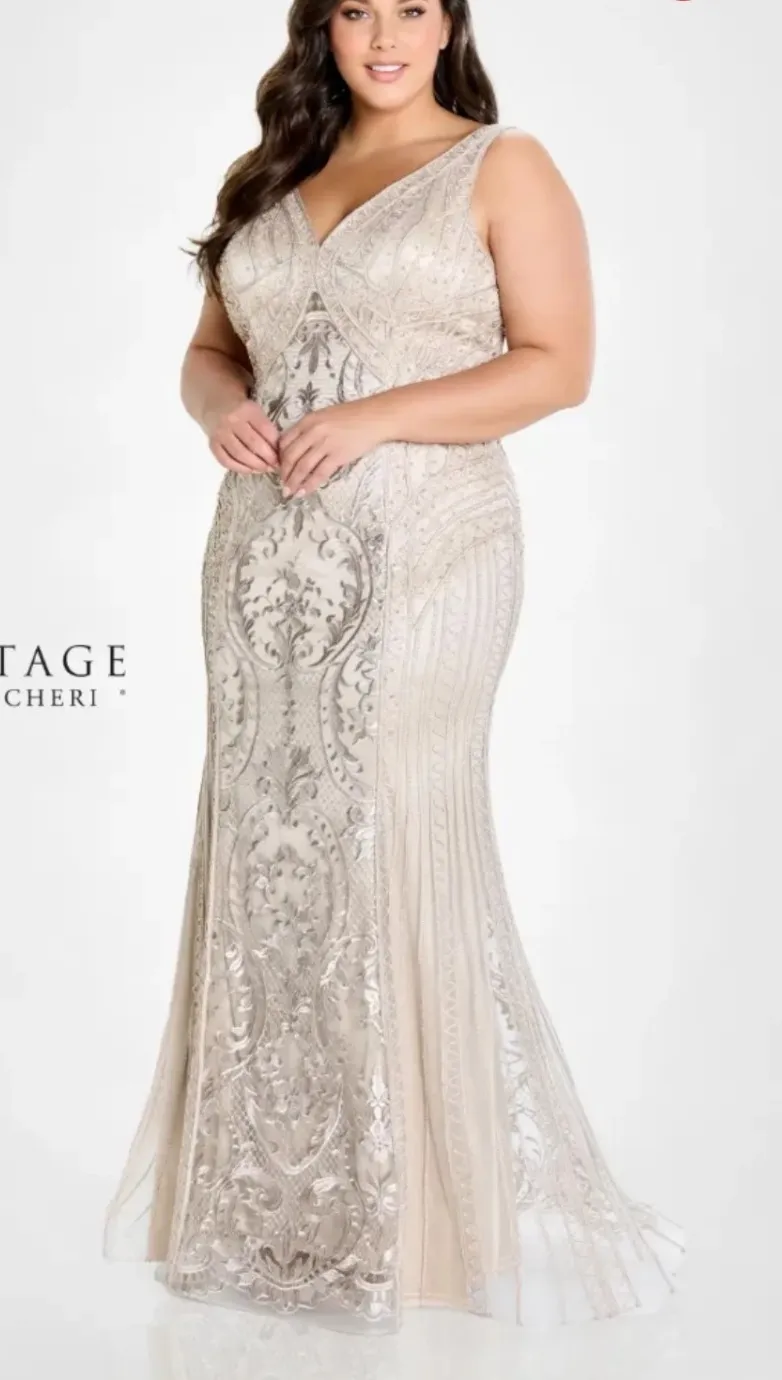 excellent condition size women's 10 MEASUREMENTS IN PHOTOS Capture timeless elegance with this exquisite Montage by Mon Cheri gown. Intricate beading and delicate ribbon work create a stunning visual tapestry across the flattering fit and flare silhouette. The shimmering embellishments catch the light with every movement, ensuring you shine on any occasion. A deep V-neckline and sleeveless design offer a sophisticated yet alluring profile, while the empire waist accentuates your figure beautifully. Perfect for galas, weddings, or any formal event where you want to make a memorable entrance. Style: Maxi, Fit & Flare, Mermaid Dress Length: Long Department: Women Sleeve Length: Sleeveless Occasion: Formal, Party/Cocktail Material: Beading, Ribbon Work Keywords: beaded dress, evening gown, formal wear, mother of the bride, prom dress, wedding guest, special occasion, glamorous, art deco, elegant, sophisticated, sequined