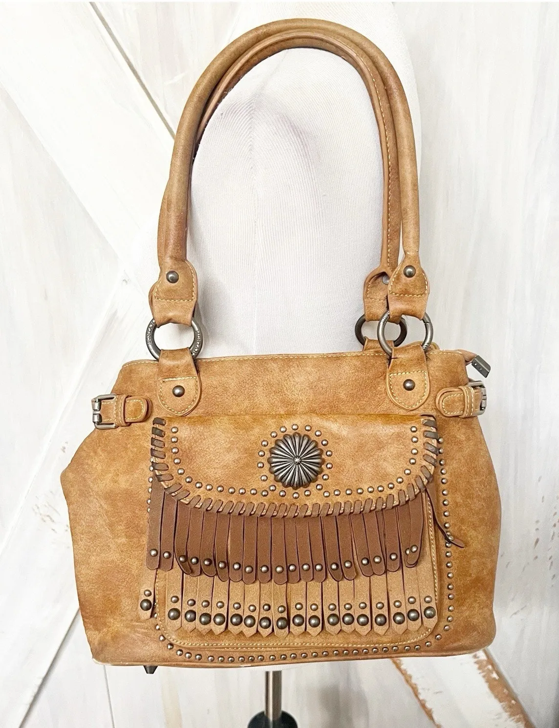 This handbag has a Western boho style with a rugged, vintage-inspired charm. It’s crafted from tan faux leather with a slightly distressed finish, giving it a soft, worn-in look. Design details: • Front flap features layered leather fringe strips and antique silver studs arranged in decorative patterns. • A large concho medallion centered on the flap adds a bold Western accent. • Double rolled handles with silver-tone rings and buckle details give it a sturdy, structured feel. • The bag has a rectangular shape with a spacious interior — practical for everyday use. Overall, it’s a Southwestern-inspired shoulder bag that blends rustic elegance with functional design — perfect for casual outfits, denim looks, or country-chic styles. Good used condition some wear at edges in back Clean interior 14” w x 10” h x 5” d x 10” drop Medium sized #westernboho#rodeo#cowgirl#yellostone