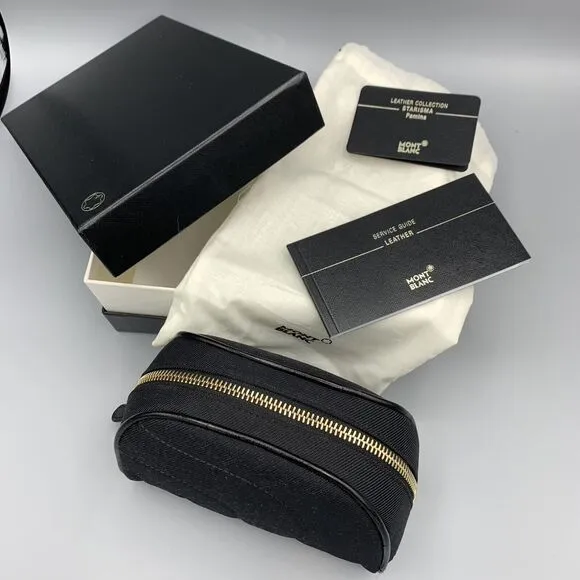 Series: Starisma Pamina Exterior: Italian full-grain cowhide, chrome-tanned, pigmented, dyed through, with imprint Interior: Jacquard lining with the Montblanc brand name, and pale gold-plated metal fittings with shiny finish Pockets: 1 compartment, zipper Includes: Service Guide Leather booklet, cosmetic pouch, dust bag, MontBlanc card and original box Approx. Measurements: Length: 6.5 in (16.51 cm) Width: 3 in (7.62 cm) Height: 4 1/4 in (10.80 cm) In New unused condition