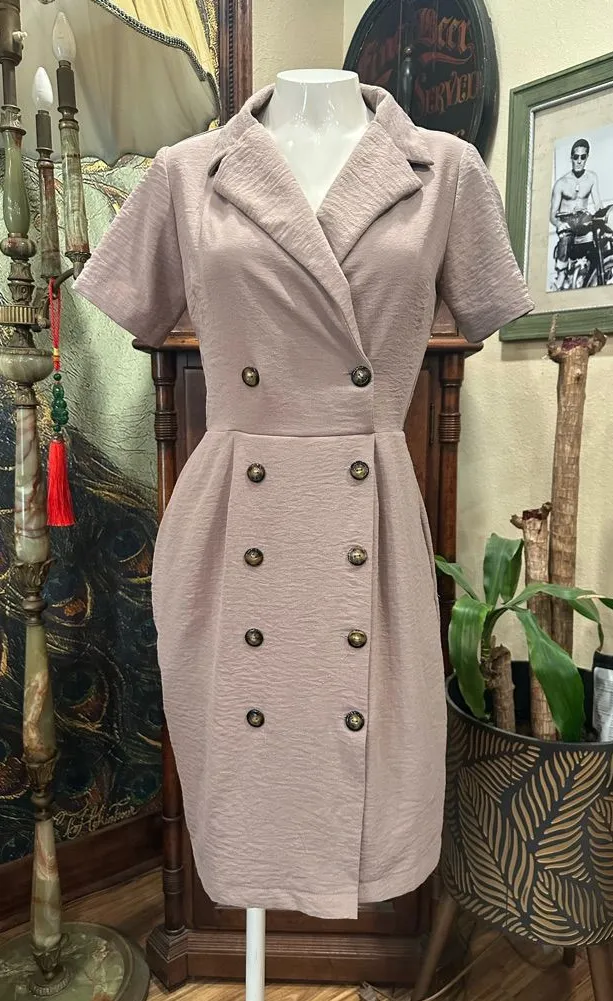 Elevate your wardrobe with this chic mauve double-breasted midi dress. Its sophisticated design and button details make it perfect for any occasion. Monteau is a fashion brand based in Los Angeles, known for offering trendy and stylish clothing. The brand focuses on quality and unique designs, providing a range of apparel including dresses, tops, and more. The specific dress in the image is described as a "New Womens Monteau Las Vegas Dress" in a beige color, featuring an A-line style and falling above the knee. #midi #dress #doublebreasted #mauve #monteau #losangeles