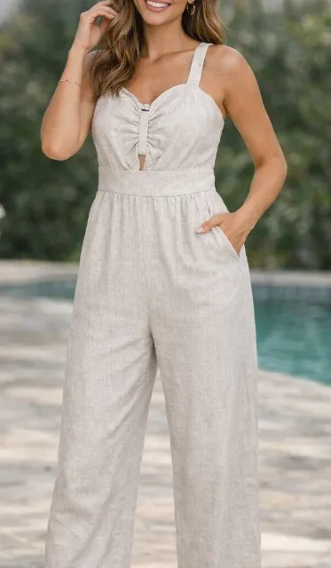 Monceau Los Angeles sleeveless jumpsuit in a neutral oatmeal/beige tone. Fabric: 70% rayon / 30% lin... Show more
