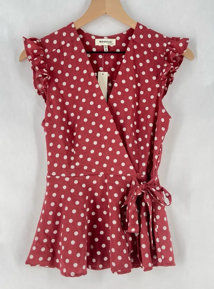 Monteau Pink Polka Dot Ruffle Cap Sleeve Faux Wrap V-Neck Tie Waist Blouse Size M Chic muted mauv... Show more