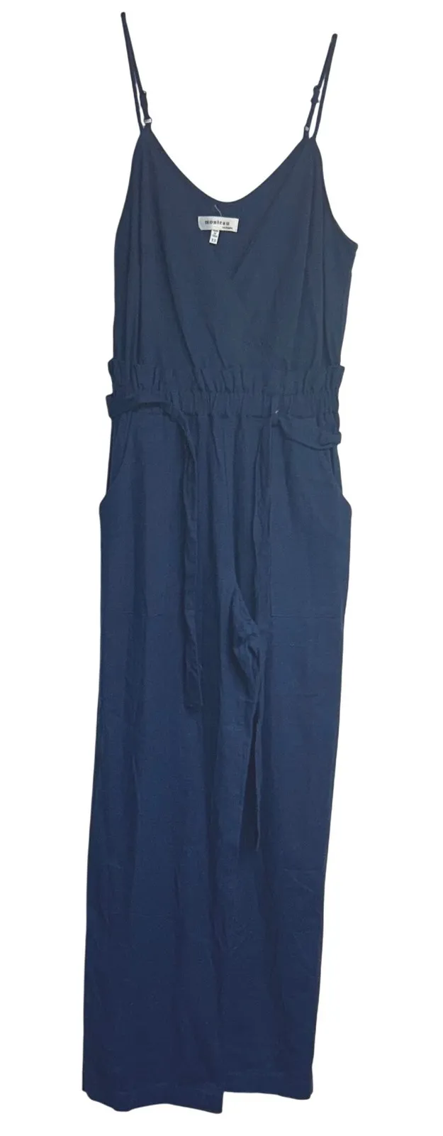 Stylish and comfortable jumpsuit in a versatile navy blue. This sleeveless jumpsuit features a flattering V-neckline and a wrap-style bodice, creating a chic and effortless look. The elasticized waist with a tie belt accentuates the figure, while the wide legs offer a relaxed and breezy fit. Perfect for a casual brunch, a summer outing, or a relaxed evening at home. Department: Women Type: One-Piece Style: Jumpsuit Fabric Type: Woven Material: Rayon, Linen Pattern: Solid Sleeve Length: Sleeveless Occasion: Casual, Travel Set Includes: Pants Number of Pieces: 1 Piece Keywords: jumpsuit, navy blue, sleeveless, wide leg, casual, womens jumpsuit, Monteau Los Angeles, wrap front, elastic waist, tie belt, summer jumpsuit, rayon linen blend, xs, extra small