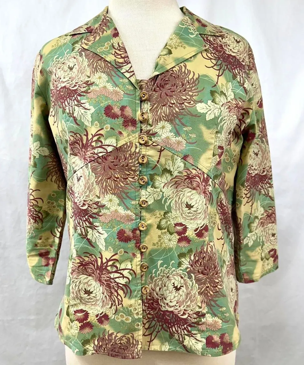 vintage 90s monterey bay green and pink floral button front 3/4 length sleeves shirt jacket shacket, size petite medium paper tags & made in USA means its vintage!! absolutely love the unique floral print MEASUREMENTS: pit to pit 20.5in flat across, length 22in D4 *79 #90svintage #retro #cottagecore #fairycore #botanical