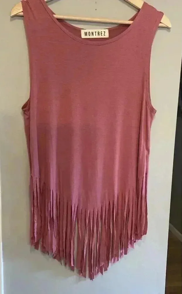 This Montrez tank top is a must-have for any bohemian-inspired wardrobe. The super soft fabric and fringe accents add a touch of effortless style to any outfit. The scoop neckline and tie closure make it easy to wear and the mauve pink color is perfect for any season. Available in size S/M, this tank top is a great addition to any collection. Sku#500
