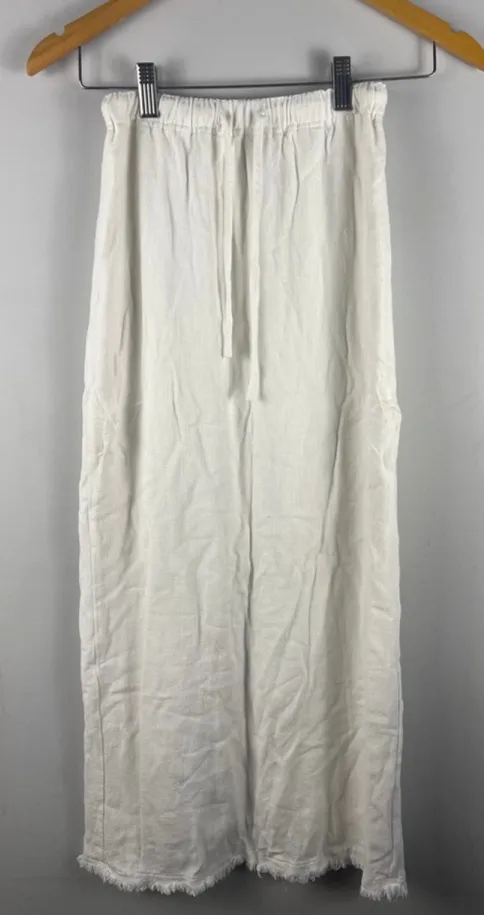 Brand: MOOLoola Size: 6 Color: Ivory / Off-White MOOLoola linen-blend midi skirt featuring an elastic waistband with adjustable drawstring, intentional raw frayed hem, and a center back slit for ease of movement. Fully lined for comfort and coverage. A versatile staple ideal for coastal, resort, minimalist, and capsule wardrobes. Fabric: • Shell: 30% Linen / 70% Rayon • Lining: 100% Rayon Condition: Excellent pre-owned condition. No stains, holes, or flaws noted. Natural linen texture and wrinkling present. This is a pre-owned Mooloola women's midi skirt in white, size 6. The shell is a blend of 30% linen and 70% rayon, with a 100% rayon lining. It features an elastic waistband with a drawstring, side pockets, and a front slit. The hem has a raw, frayed edge. The skirt appears to be in good condition with no significant visible imperfections.