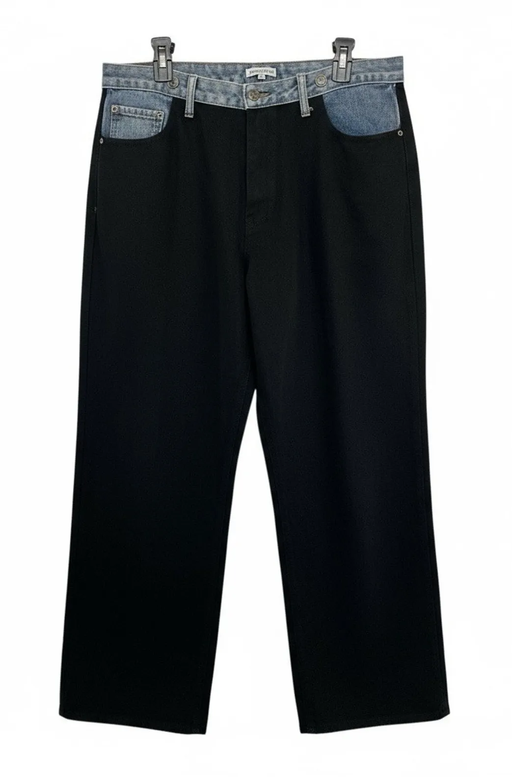 Moon River two-tone, wide-leg jeans featuring a black main body and a contrasting denim waistband, possibly from the 90s/Y2K era. Moon River products, including stud-detail denim pants and other apparel, are available at retailers such as Shopbop and Anthropologie Natural Waist 31.5 33 Drop Waist 33.5 35 Hips 41.5 43