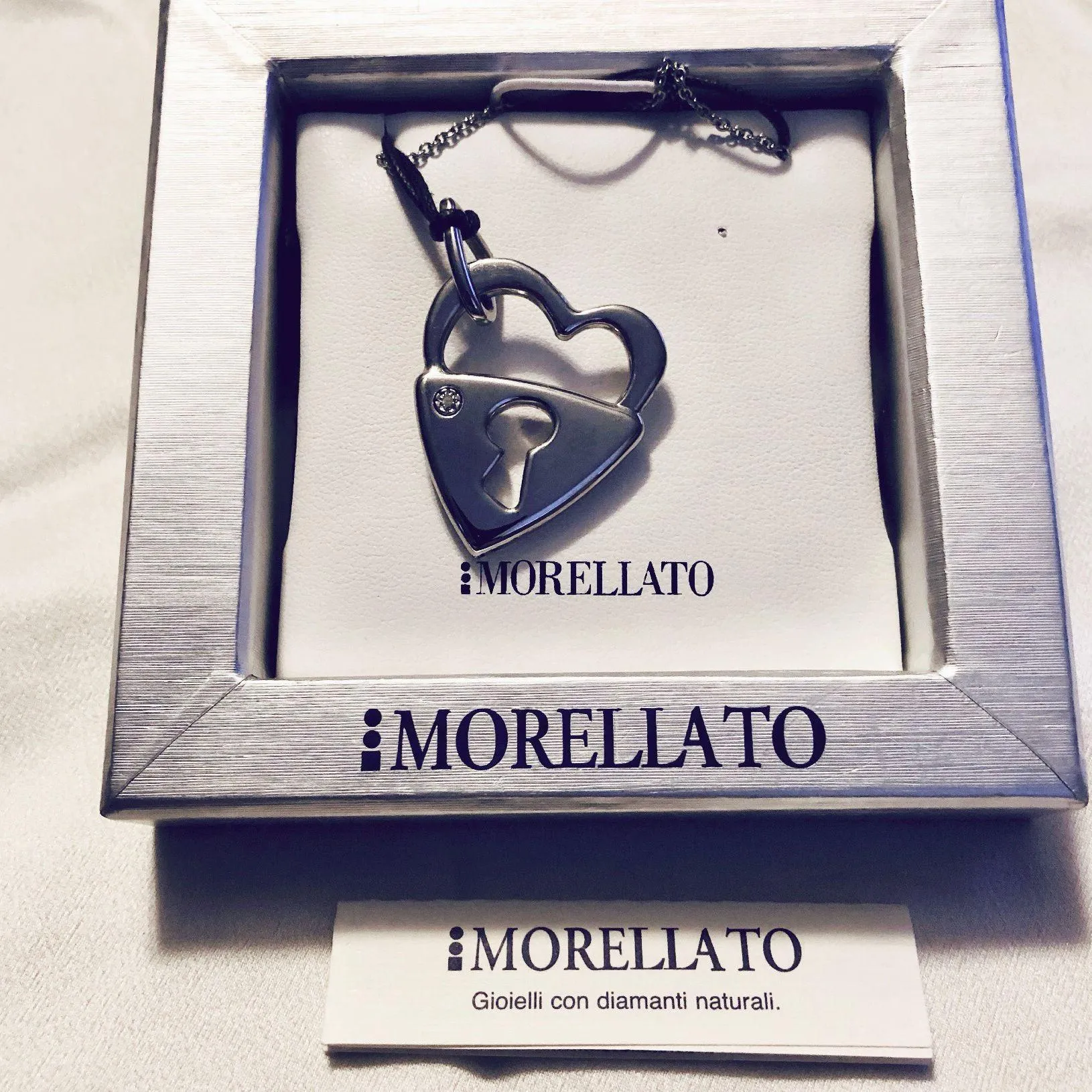 Modellato Made in Italy hand polished stainless steel heart lock pendant with natural diamond accent, has different interchangeable steel chain or leather string necklace, approximately 15” length, pendant measurements visible in pics. This beautiful piece is new in original box