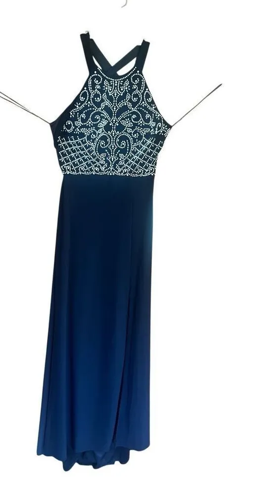Morgan & Co Strapy Open Criss Cross Back Maxi Gown Dress Sz 7/8 Navy/White NWT This has like a water stain and a pull on the inside, Back of the dress. On the inside lining. Can not notice at all. Picture Shown Back Zipper. White Pearls and silver rhinestone chest. The back is a little bit longer than the front.