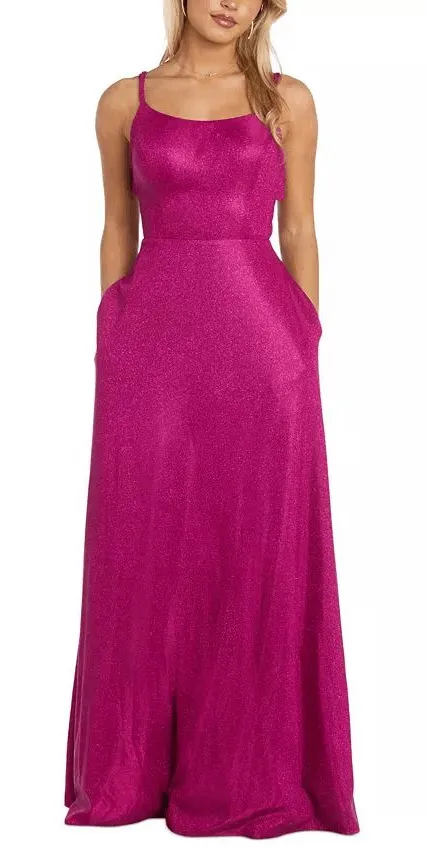 Morgan & Company Juniors' Sweetheart Neck Shimmer Gown. Beautiful prom dress with a magenta shimmer fabric, pockets, strappy back, and lining. Make me an offer! Condition: new with tags Measurements are taken while laying flat: Bust not taken due to strappy back Waist 13" Length from waist to hem 43.5" SKU0325-C3m-79