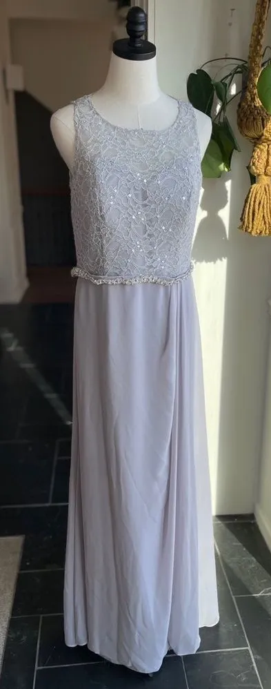 Morilee by Madeline Gardner. This is a gorgeous, formal dress perfect for bridesmaid, prom, or any formal occasion. The color is officially called silver, but it is not metallic silver, it is light gray. There is a beautiful band of rhinestone bead work around the waist separating the lace top from the flowing chiffon skirt. Back zip with decorative covered buttons along the zipper placket. Measurements are approximate and taken while laying flat: 57 inches shoulder to him, 17 inches straight across the waist and 19 inches from armpit to armpit. Molded cut bust accommodates cup size
