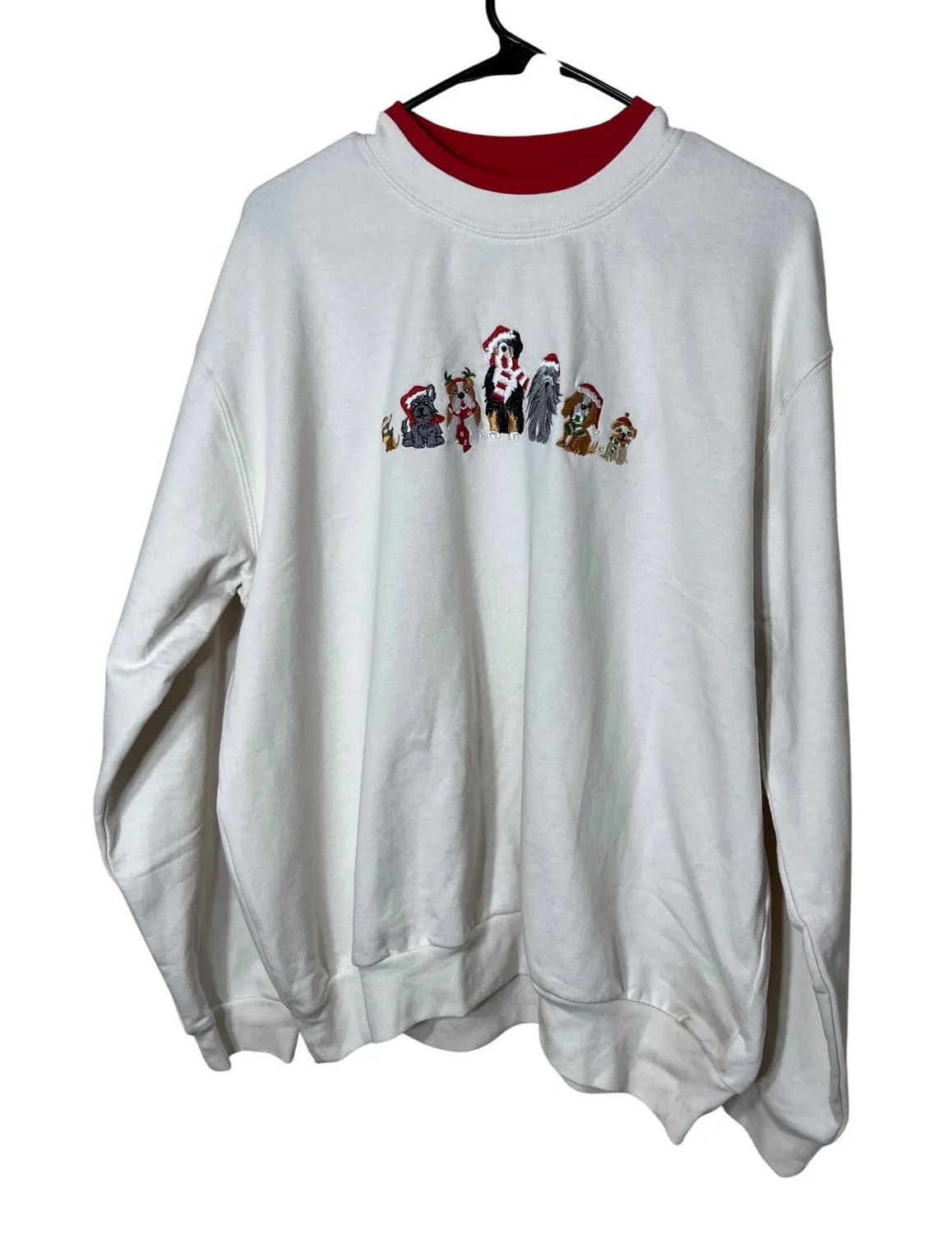 Morning Sun women's white long sleeve crew neck sweatshirt with a festive holiday dog embroidery. This top features a double layer look with a contrasting red collar. The front displays an adorable embroidered scene of various dog breeds dressed in Santa hats and festive scarves. There are a couple stains shown in the pics Measurements: • Chest: 25 in • Length: 27 1/2 in • Sleeve Length: 24 in Style: Pullover Department: Women Type: Sweatshirt Theme: Christmas, Holiday Features: Graphic Print Pattern: Solid Material: Cotton, Polyester Accents: Embroidered Sleeve Length: Long Sleeve Neckline: Mock Neck Keywords: holiday, christmas, dogs, embroidered, crewneck, pullover, winter, casual, dog lover, festive