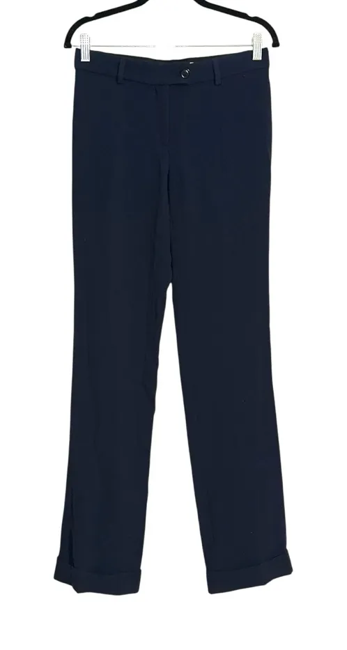 Elevate your wardrobe with these classic dark blue dress pants. Perfect for any occasion, offering both style and comfort. Features Button and zipper closure Belt loops Straight leg Mid-rise Rolled hem Size: 6 Color: Navy Materials: 64% Triacetate/36% Polyester Waist: 14.5 in Rise: 8 in Inseam: 32 in Measurements are proximate laying down flat