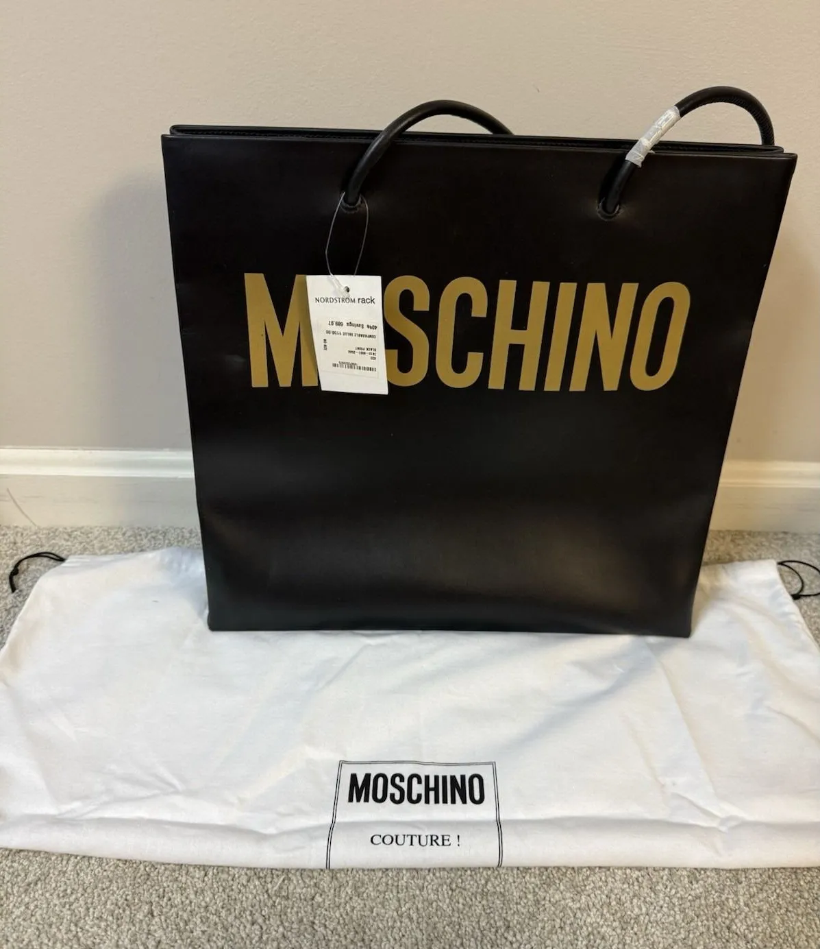 Elevate your style with this authentic Moschino Couture black leather tote bag. Featuring a bold gold MOSCHINO logo on the front, this spacious shopper is perfect for daily use or as a statement accessory. • Brand: Moschino Couture • Color: Black with gold lettering • Material: Smooth faux leather • Hardware: Gold-tone snap closures • Straps: Dual rolled handles • Includes: Original Moschino dust bag & Nordstrom Rack tag • Size: Approx. 13.5H x 14" W x 5.5" D • Condition: New with tag. Minor surface marks (see close-up photos) from storage. Perfect for carrying essentials in style—don't miss out on this luxury piece at a fraction of retail!