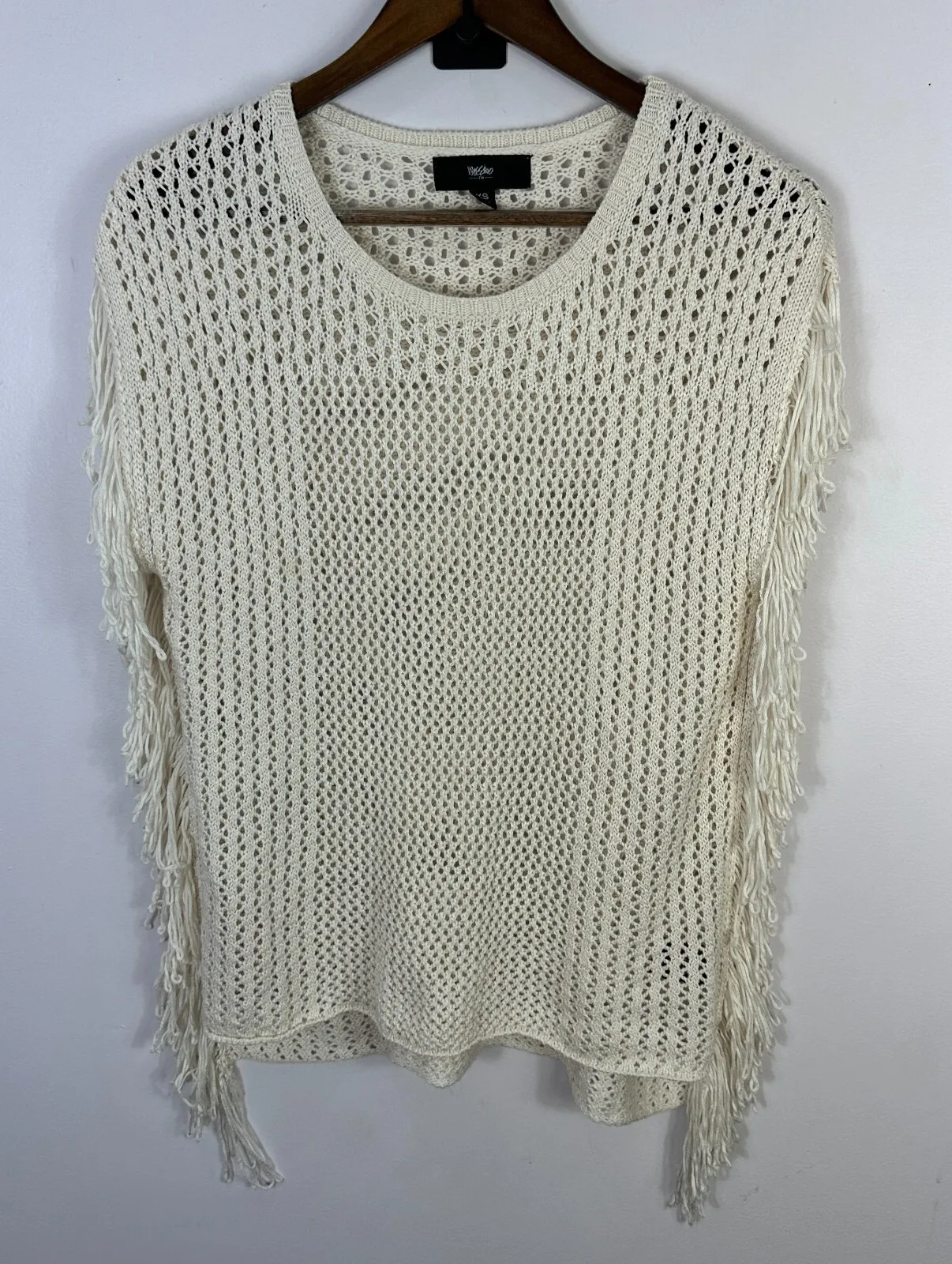 Brand: Mossimo Size: XS Color: Cream / ivory Material: 100% Acrylic Style: Fringe sleeve open-knit p... Show more