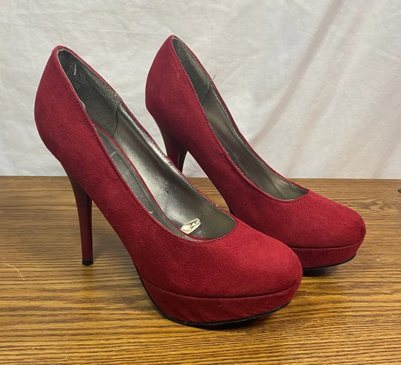 Command attention with these striking burgundy platform pumps from Mossimo. A sleek silhouette is crafted by the rounded toe and stiletto heel, while the plush faux suede exterior adds a touch of luxury. The sturdy platform provides extra height and comfort, making these heels perfect for all-day wear. These pumps are a versatile addition to any wardrobe, easily transitioning from a power meeting to a night out. Step into confidence and elevate your style with these chic and sophisticated heels. Perfect for a cocktail party, date night, or adding a pop of color to your work attire. Color: Red Style: Pump Department: Women Upper Material: Suede, Faux Suede Type: Heel Heel Style: Stiletto Toe Shape: Round Toe Pattern: Solid Heel Height: High (3-3.9 in) Closure: Slip On Features: Platform, Stiletto Heel, Suede, Comfort, Party Model: Platform Pump Keywords: Mossimo, platform pumps, heels, burgundy heels, stiletto heels, women's shoes, size 7.5, suede heels, party heels, career heels, red heels, dress shoes, formal shoes