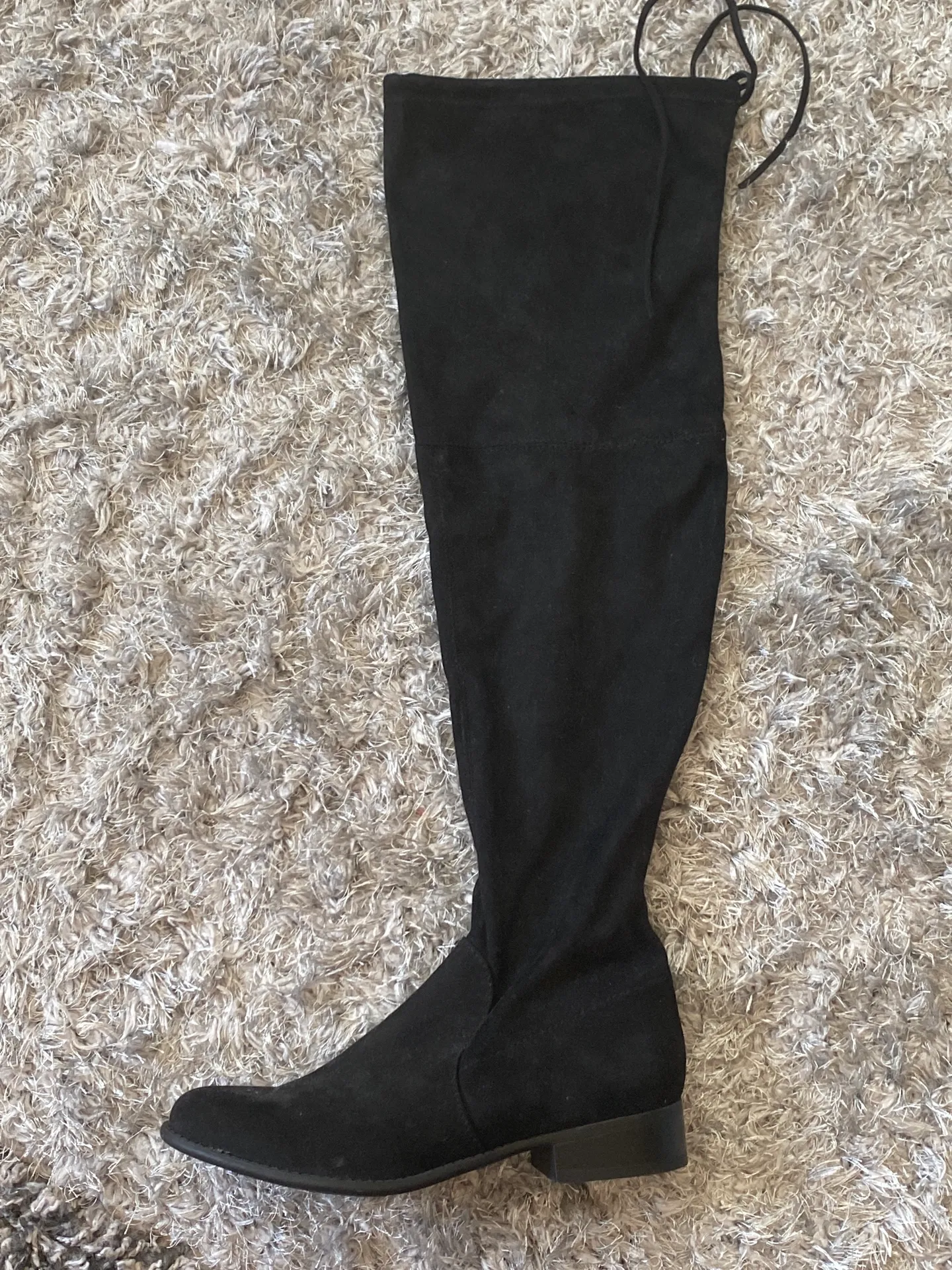 Black suede thigh high boots. About an inch heel on them. Brand new without tags. Zipper on the inne... Show more