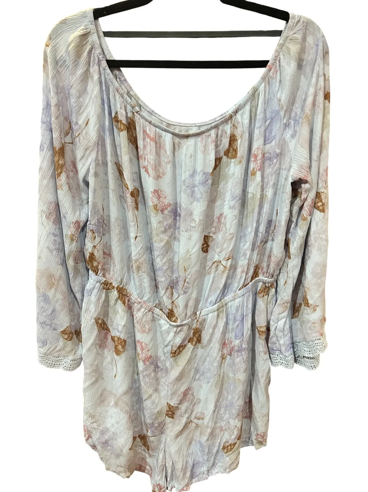 Lovely floral print romper for women, designed with a relaxed, comfortable fit perfect for warm weather outings. Features a beautiful all-over floral pattern in shades of blue, purple, and brown. This romper has a flattering scoop neckline and long sleeves with delicate lace trim on the cuffs. The elasticized waist creates a defined silhouette, while the lightweight fabric ensures breathability and ease of movement. An excellent choice for casual gatherings, garden parties, or a day at the beach. Color: Blue Department: Women Type: One-Piece Style: Romper Character Family: Floral Fabric Type: Chiffon Material: 100% Viscose, Rayon Blend Pattern: Floral Sleeve Length: Long Sleeve Character: Boho Girl, Flower Child, Free Spirit, Garden Party, Beach Babe Occasion: Casual, Party/Cocktail, Travel Set Includes: Romper