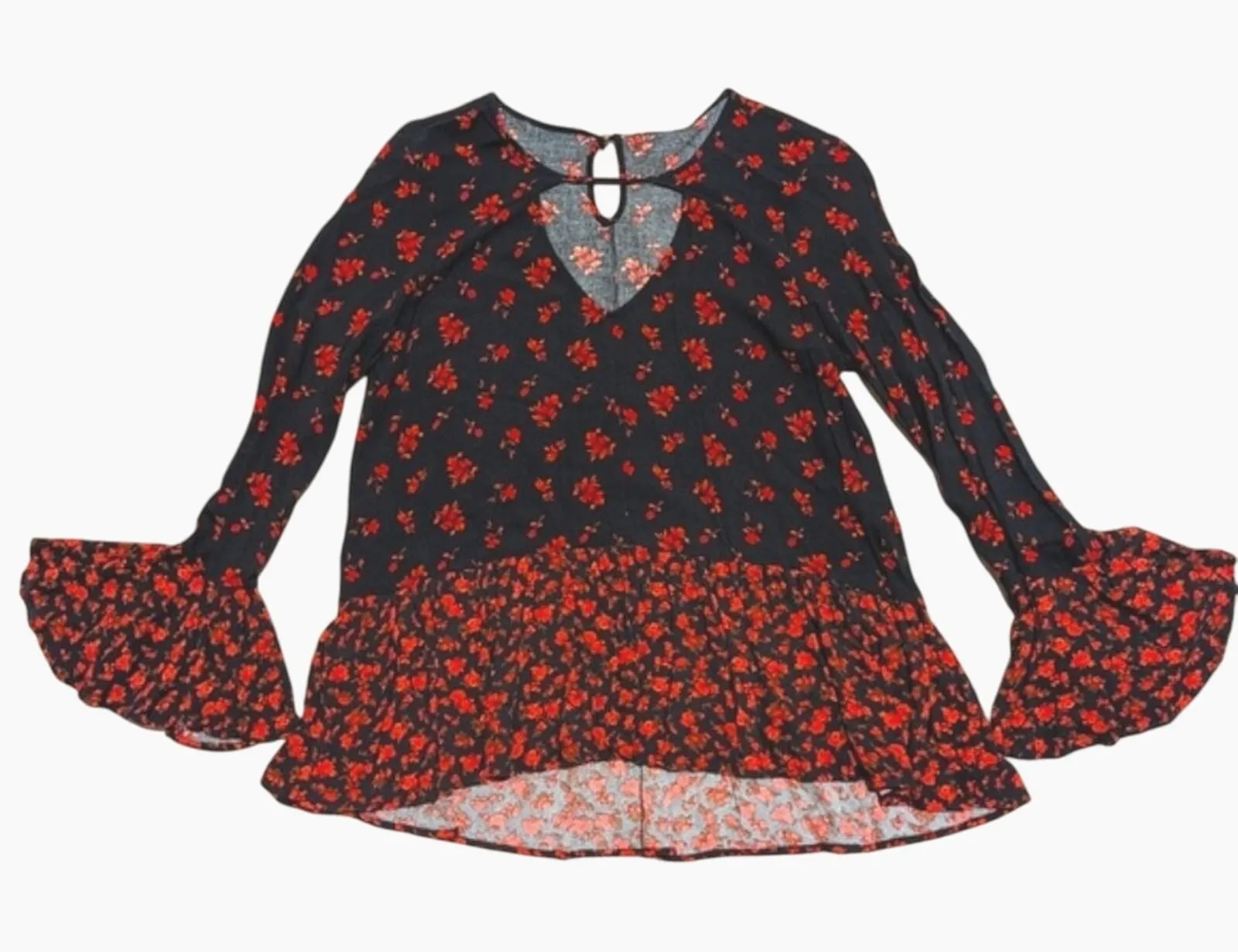 Mossimo ruffled long bell sleeved hi low top in Women's plus XXL. The striking red and black floral pattern is complemented by a cut out design at the neckline and ruffle details on sleeves and hem. So cute! FABULOUS condition! bust 44" length 27" in front, 31" in back