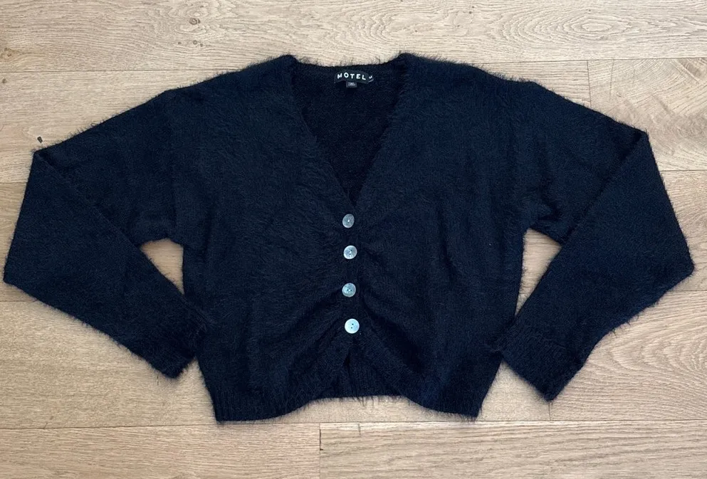 Motel Jiyo V Neck Gathered Cardigan KR1225-K9 Size : M Color : Black Condition : Great Pearl-like b... Show more