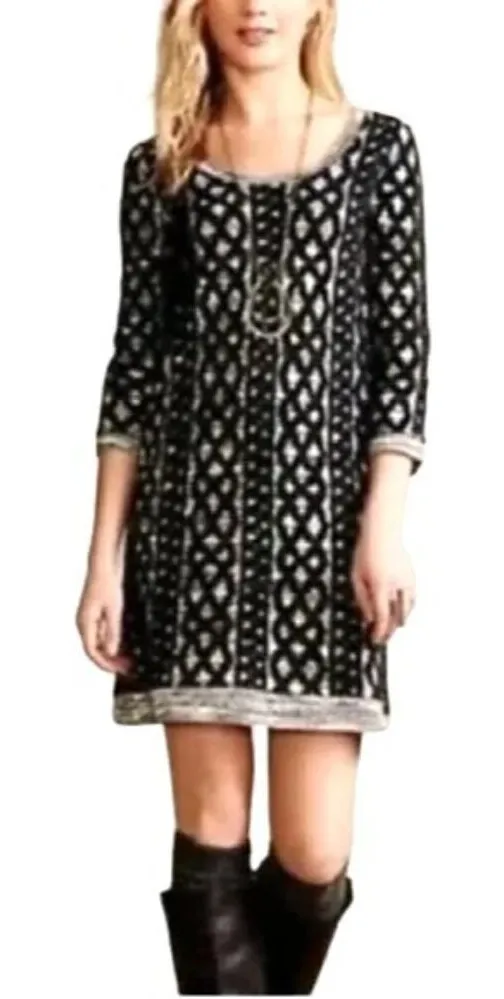This dress by Moth by Anthropologie is in excellent condition. It is in black and ivory colors in an allover textured knit fabric. It features; a scoop neckline, 3/4 length sleeves, a shift silhouette, mini length and a pullover style. Made in an acrylic, cotton, nylon and wool blend. Condition: Excellent Color: Black, Ivory Material: Acrylic, Cotton, Nylon, Wool Maje S Measurements: armpit to armpit 17 in, length 36.5 in, sleeve 19.5 in, Short, Shift, LS, Long Sleeve, holiday, spring, fall, winter, church, stylish, trendy, sophisticated, chic, Crepe, Pullover, date night, night out, holiday, Valentine's Day, Christmas, designer, luxury, party, wedding, professional, business, workwear, casual, classic, classy, acrylic, cotton, wool, S, Small, anthro, anthropologie, knit, textured, trendy, stylish, chic, slimming, stretch, sweater dress, knit sweater